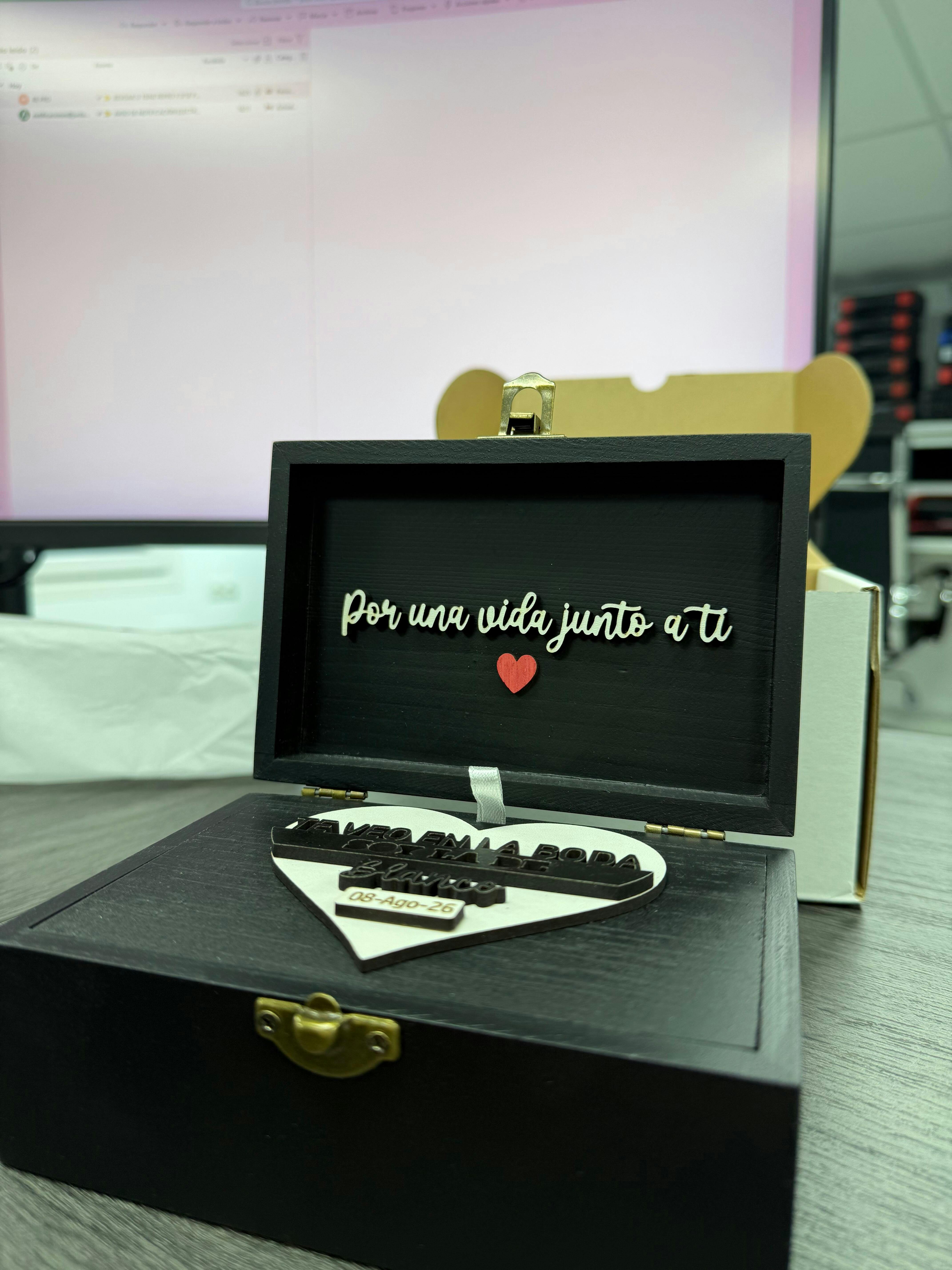 - Grabado o relieve en la tapa con los nombres de los novios y la fecha de la boda.