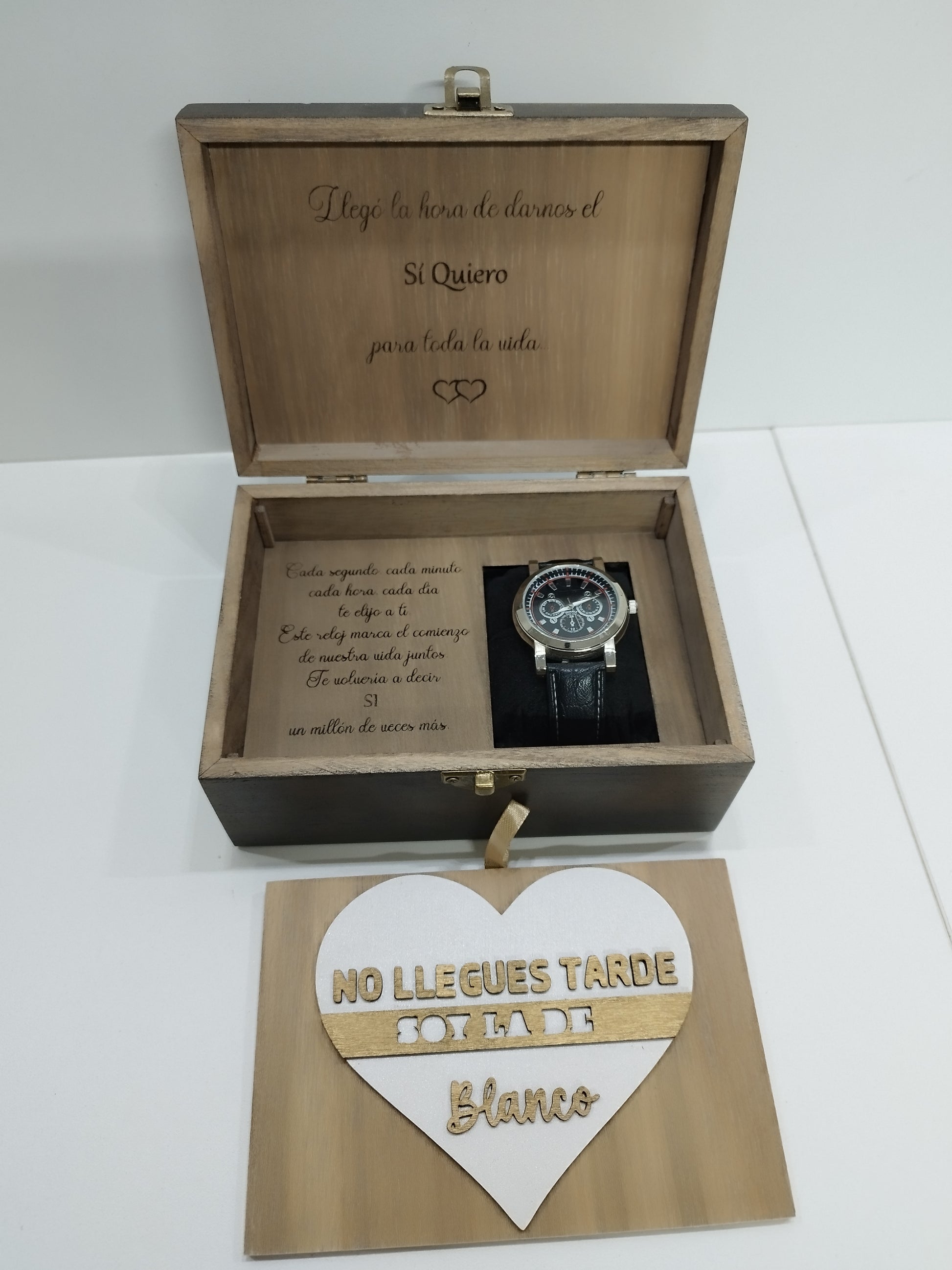 Frase Interior del reloj: Este reloj marca el inicio de una nueva etapa juntos. Si volviera a nacer intentaría encontrarte antes. Te quiero, tipología 1